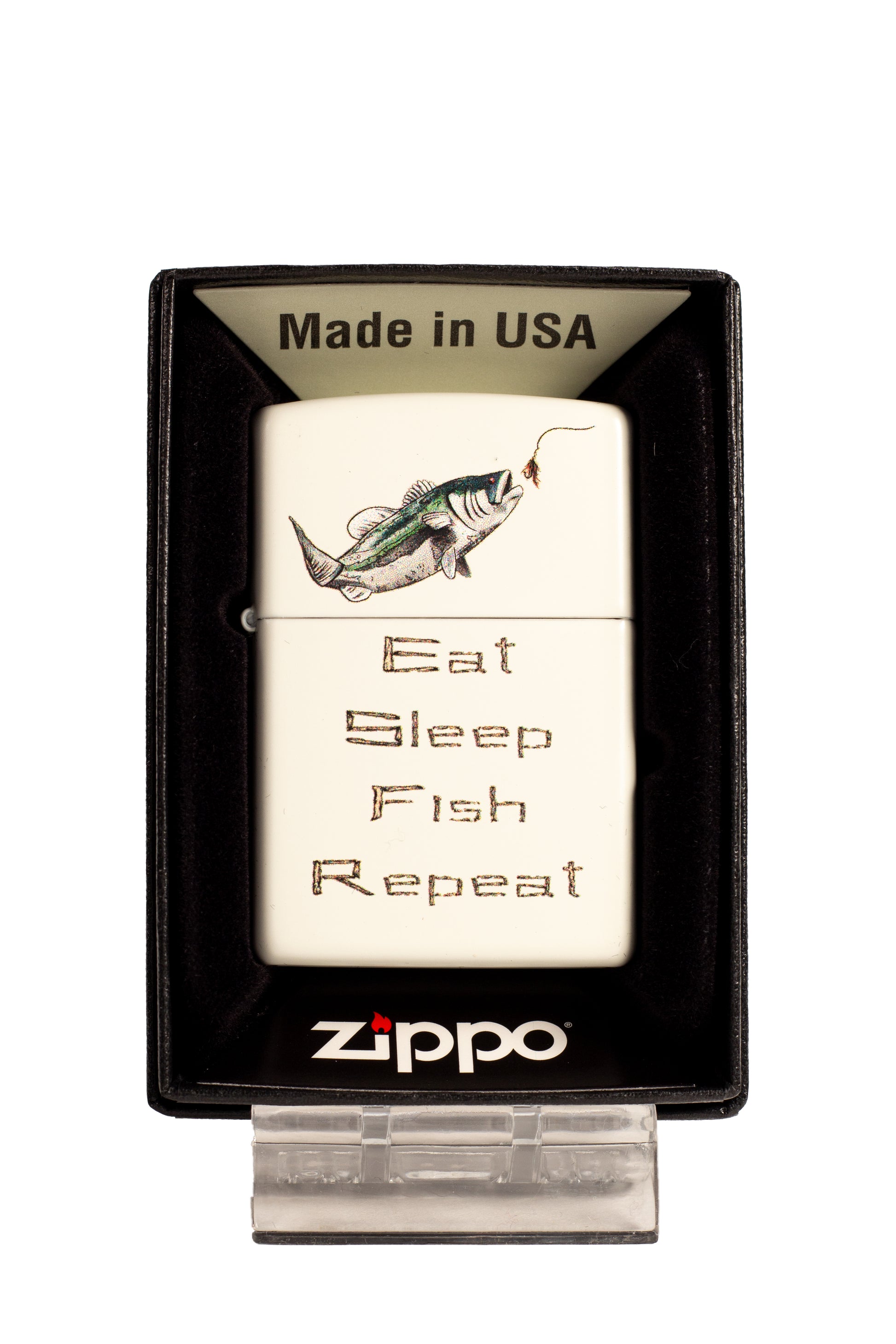 Eat, Sleep, Fish, Repeat with Bass Fish - White Matte Zippo Lighter